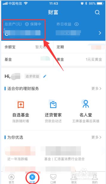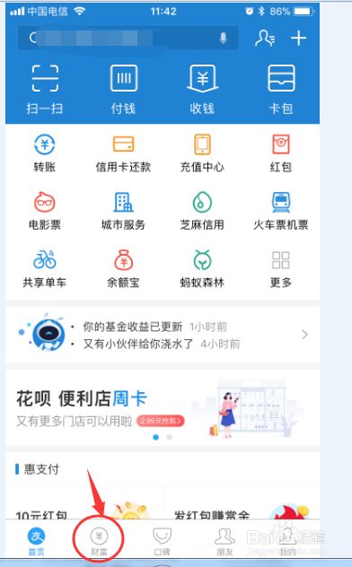 1、打开自己手机上的支付宝,最新版本的支付宝加上了财富模块,点击此模块