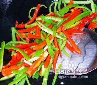 然后开锅热油,下姜丝、辣椒丝、胡萝卜丝快速爆炒一下,可上一点老酒、料酒加味:
