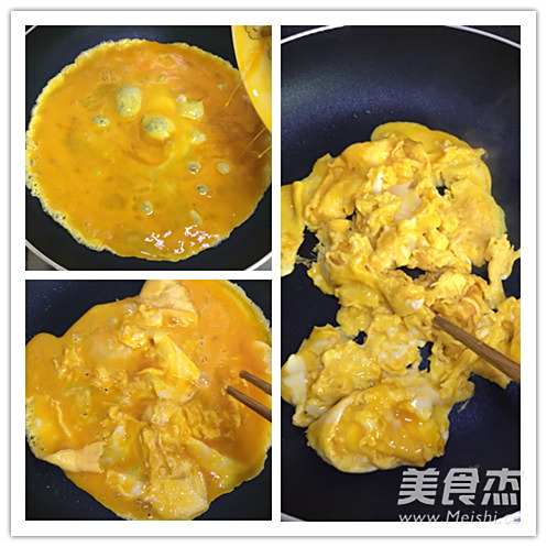 2大火,平底锅中放入少许底油,然后倒入鸡蛋液,等但也冒泡了就用筷子滑动,等到蛋液差不多凝固了就可以关火盛出。