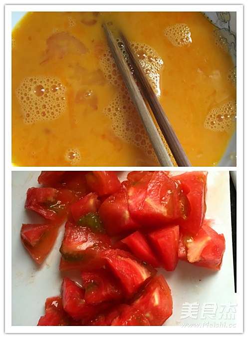 1鸡蛋打散后用筷子蘸食盐再打几下拌匀。番茄去皮后切成小块。