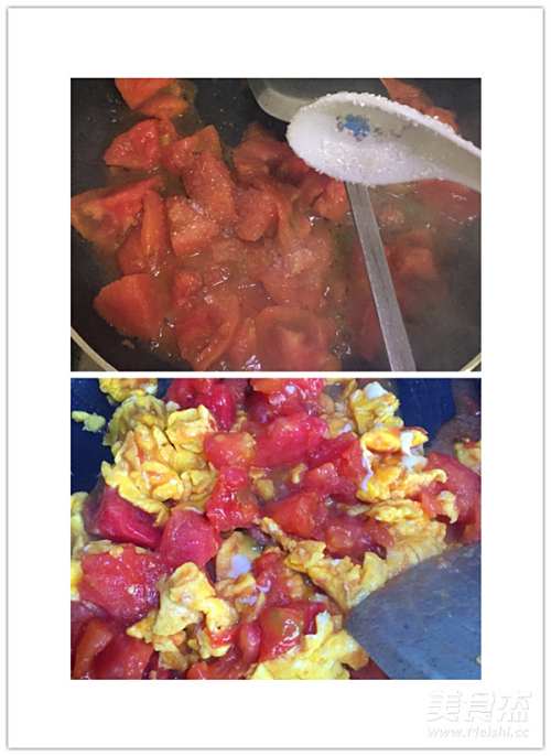3锅中放入少量底油然后放入番茄丁,然后翻炒出汁后加入适量白糖再翻炒十来秒,加入鸡蛋滑匀就可以出锅了。END