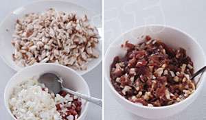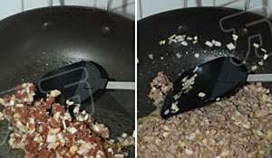 牛肉切丁,加生抽、料酒、葱花、蒜末拌匀,腌制30分钟;香菇切碎。