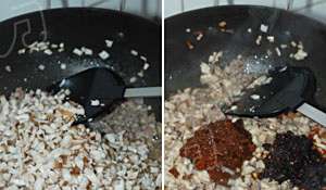 倒入香菇继续翻炒,加豆豉辣酱和豆瓣酱翻炒均匀。