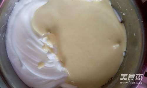 11上图为搅拌好的状态,一定要把蛋白霜和蛋液搅拌均匀这样内部组织会比较好