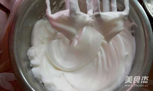 9打发蛋白,分三次将白砂糖放入,直至打发至提起打蛋器有直立的尖角,图为打发好的状态,同时预热烤箱