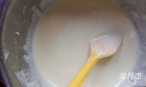 8将面粉与蛋黄液搅拌均匀,形成细腻有流动性的蛋黄糊,图为搅拌好的状态
