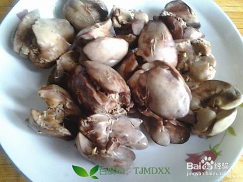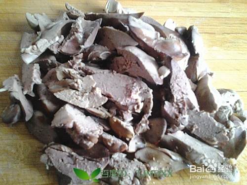 煮好的鸡肝切成如下面图片中所示的形状备用。切的时候慢慢切,要不鸡肝最容易切碎。