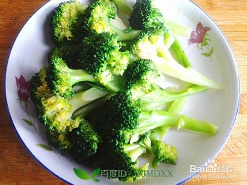 把焯好的西兰花小朵捞出来,装在一个干净的盘子里备用。焯一下西兰花变得更绿了。一看都有食欲。