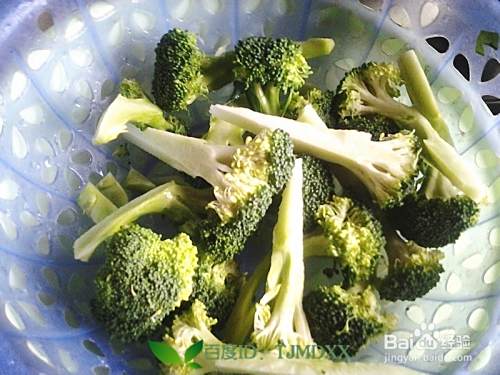 洗净的小西兰花用菜刀分开,切成小朵,用开水焯一下备用