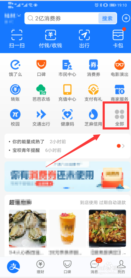 打开支付宝软件,进入主面板,点击全部选项;
