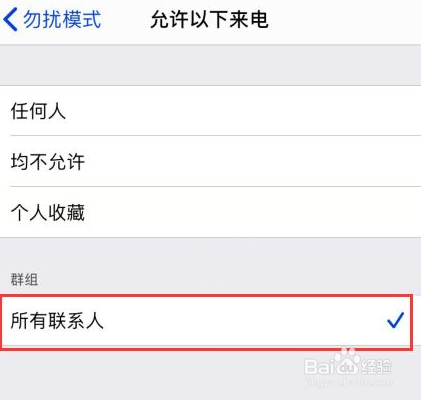 可以通过苹果手机设置功能,在勿扰模式页面设置允许以下来电为所有联系人状态即可。