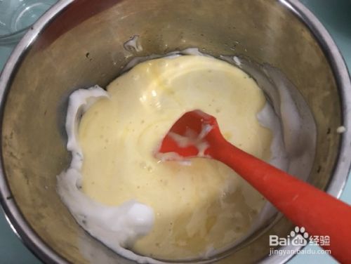 取三分之一的蛋白霜,跟之前混合的蛋黄面糊混合,翻拌均匀