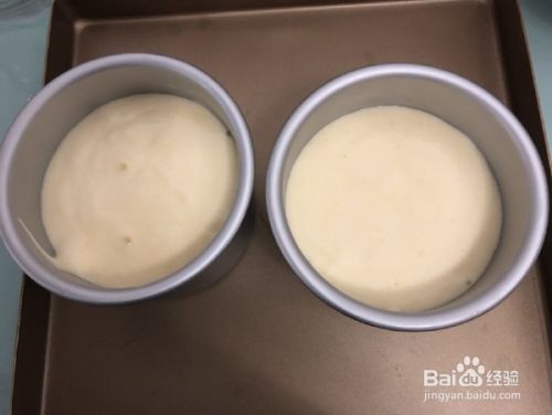均匀后的面糊,倒入2个4寸的蛋糕模具里,轻震几下,排出气泡,这是6寸的方子哦