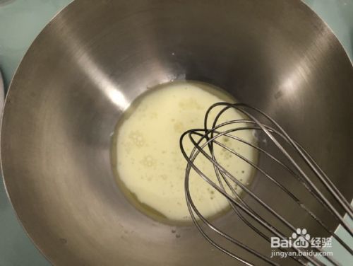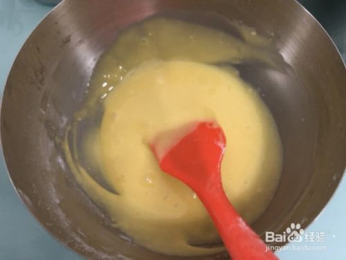 把煮好的牛奶,边加入蛋黄面糊边搅拌均匀