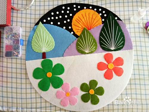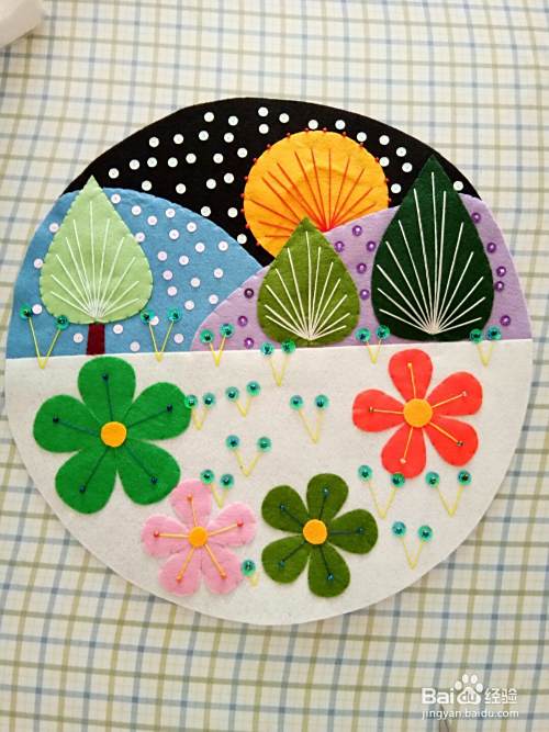 树木和太阳都被装饰起来了。把亮片拿出来缝在天上。亮片用透明的米珠装饰