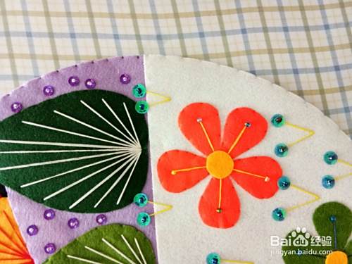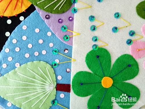 山坡上还缝上了装饰用的亮片。亮片为浅紫色和深紫色,与山坡相似。下面的草用大的亮片和蓝色的。