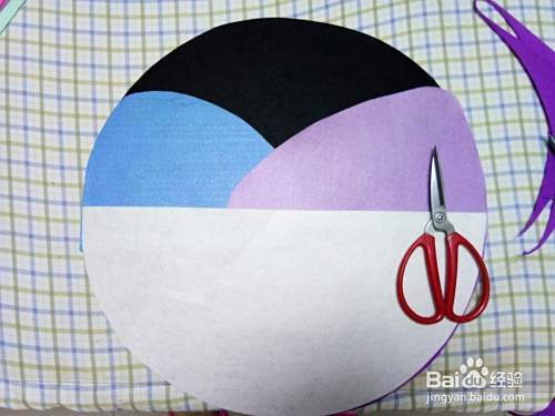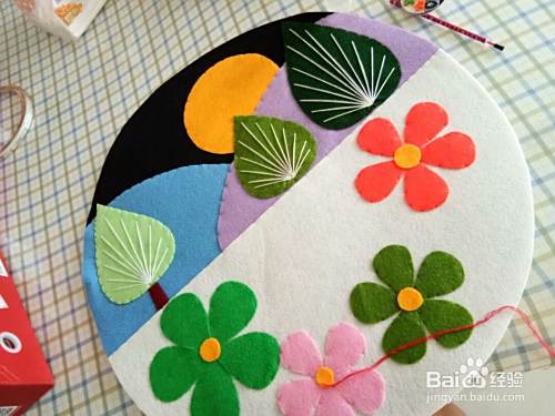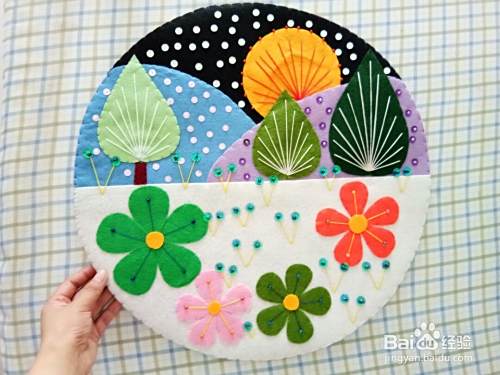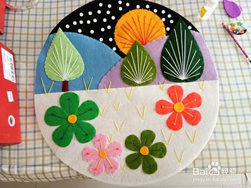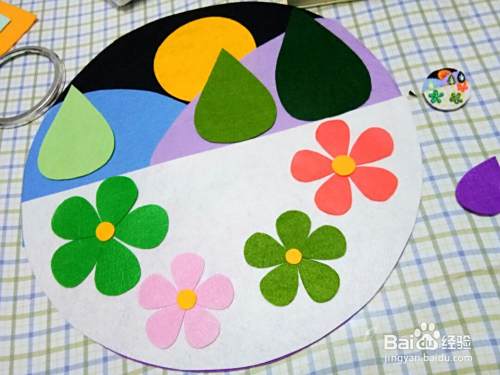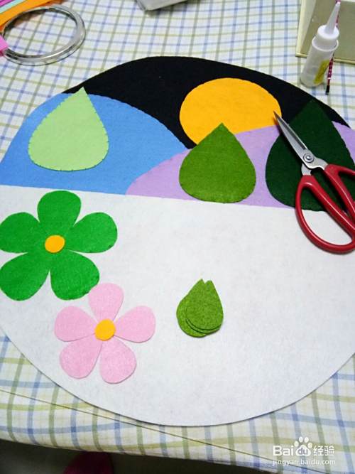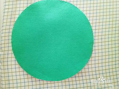 把非织造布拿出来,用脸盆画一个大圆圈,剪下来,再用其他颜色的布把山坡剪下来