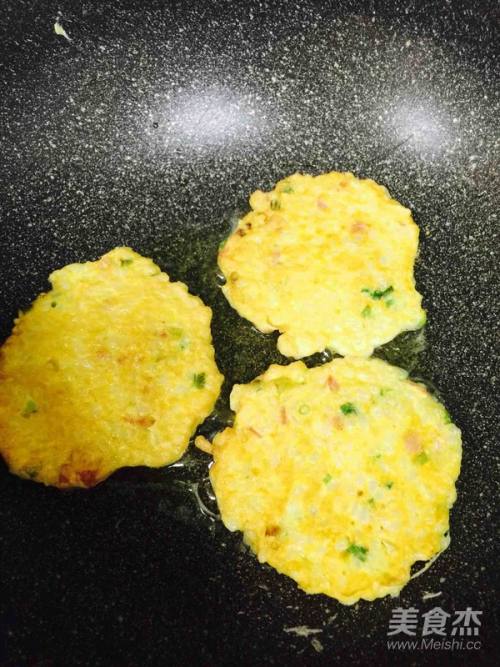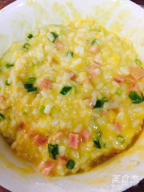 2葱切末,火腿切丁,混到米饭里,加入鸡蛋,面粉,适量盐和五香粉,