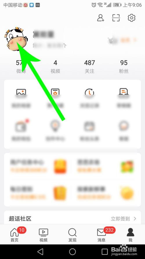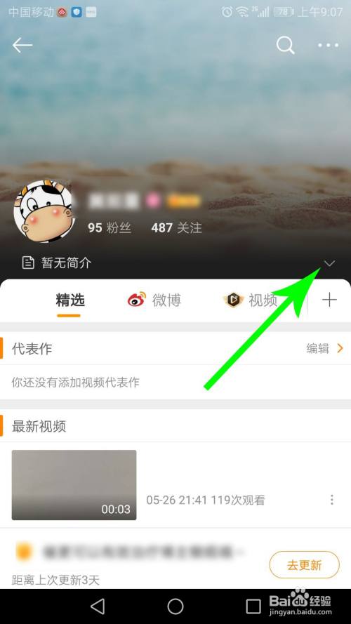 打开微博个人主页点击“箭头”图标,位置见下图。