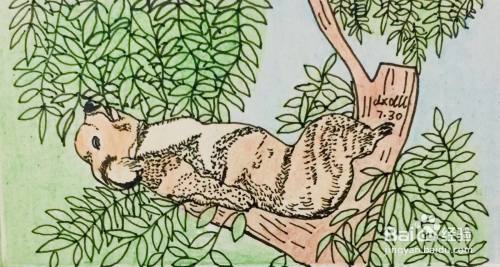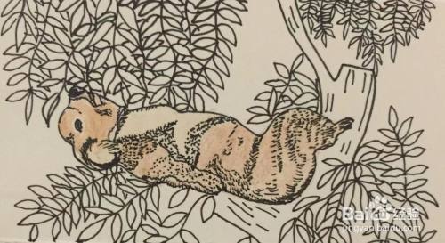 咖色和浅咖色彩铅画笔为考拉的毛发上色,黑色勾线笔画出考拉的身体毛发纹理。在其树干表面画出树皮纹理。