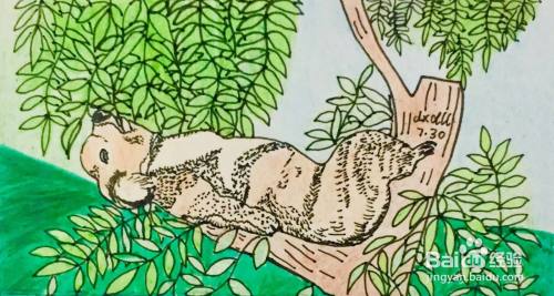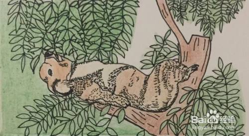 蓝色彩铅画笔为天空上色,绿色马克笔加深考拉下方的桉树树叶。这幅关于考拉的彩铅画就完成了。