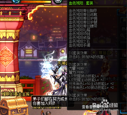 我们首选的套装是血色残阳,可以将技能的攻击力发挥到最大的效果,本来这个职业就是靠大范围的技能攻击怪物,可以将其效果更佳,如图所示。