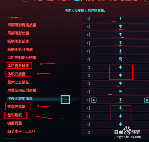 在高级设置项目栏中,体积雾分辨率,体积云质量,环境光遮蔽,色彩精度对游戏帧数有加大的影响,这里我们可以将设置为中。