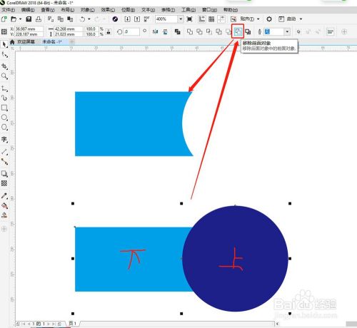 将2个对象重叠后,点击【移除前面对象】,即可删除上面对象并修剪下面对象。