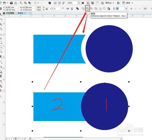 将对象1重叠在对象2上面后,点击【修剪】,即可使对象1修剪对象2成为一个新对象。
