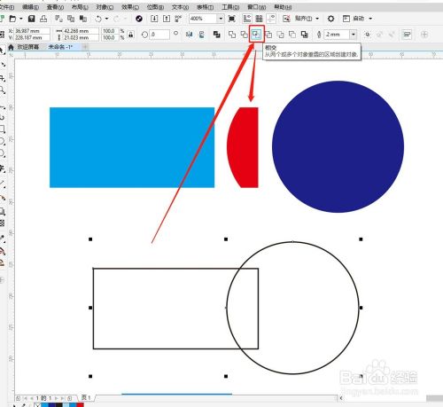 将2个对象重叠后,点击【相交】,即可使对象重叠相交部分建立一个新对象,如下图红色对象。