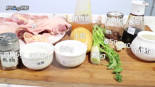 1食材展示:鸡、土豆、葱5克,姜5克、蒜10克、白糖5克等所需食材及用量。
