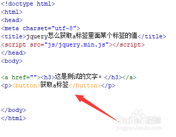 在test.html文件内,使用button标签创建一个按钮,按钮名称为“获取a标签”。