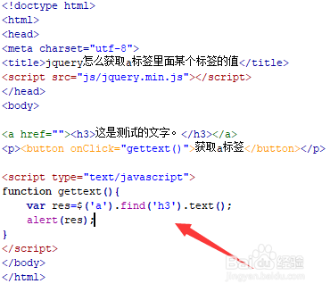 3、在js标签内,创建函数,在函数内,通过元素名称获得a标签对象,使用find()方法找到a标签下面的某个标签,例如,找a标签下面的h3标签,通过text()方法便可以获得标签的值。
