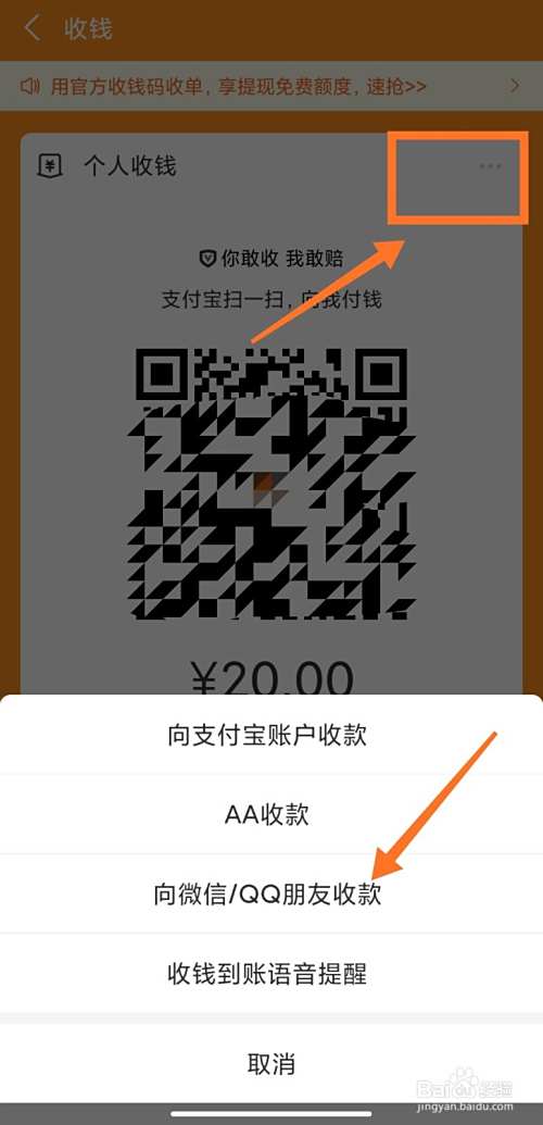 在收钱界面,点击二维码右上方的【。。。】,下方界面,点击向微信/QQ朋友收款;