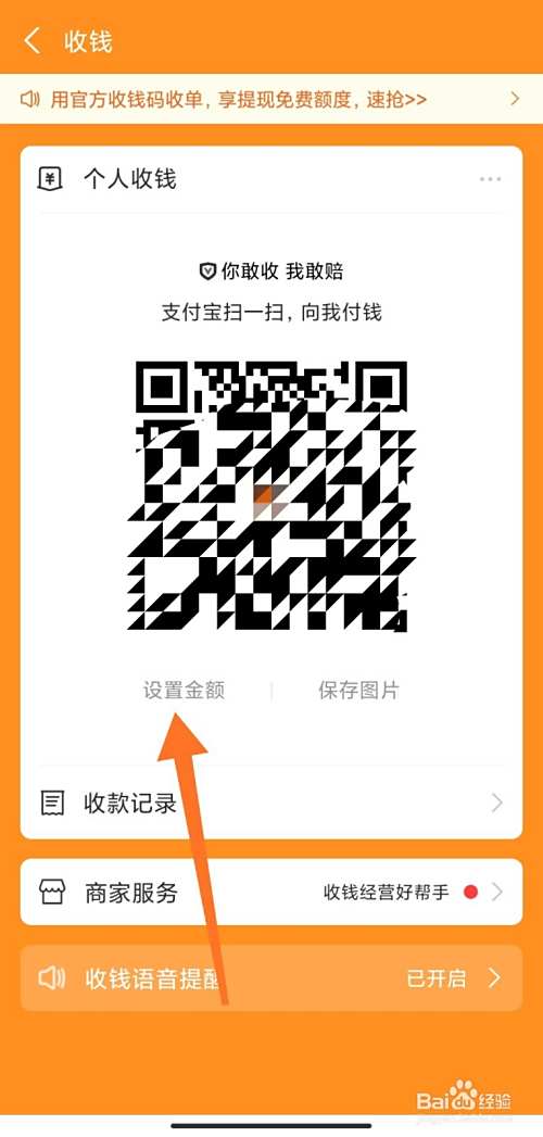 在付钱/收钱页面下方点击收钱;进入收钱界面,点击设置金额;