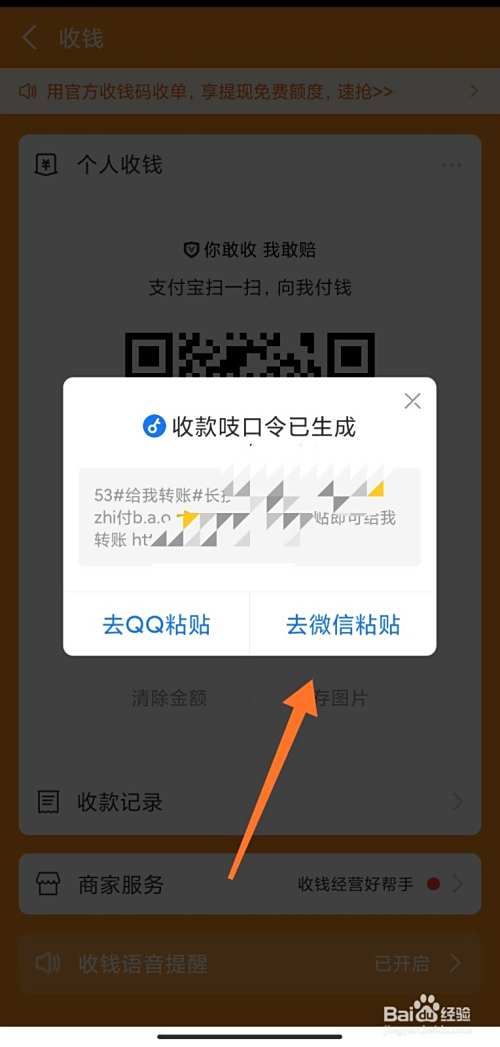 复制收款吱口令,向好友进行发送,让好友进行付款。