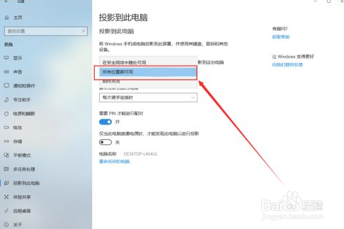 点击投屏到此电脑选项,选择“所有位置都可”。