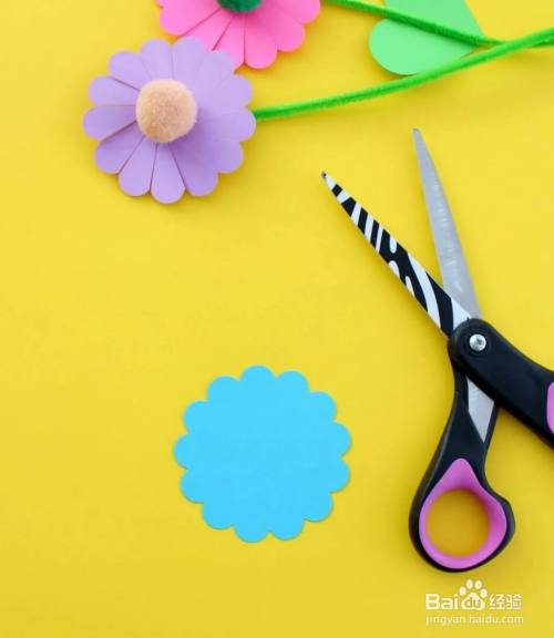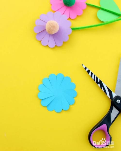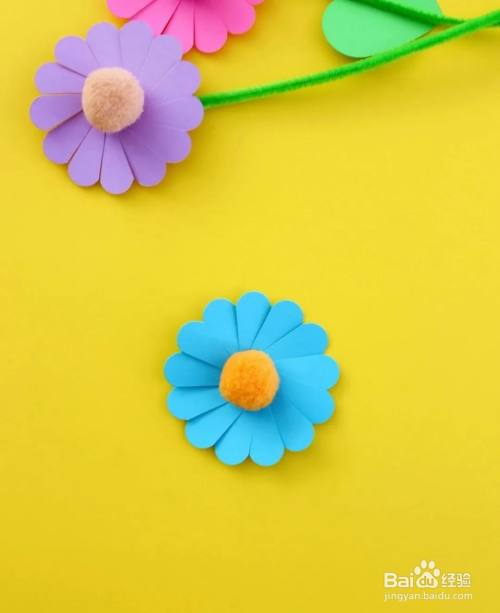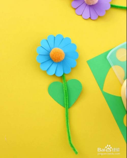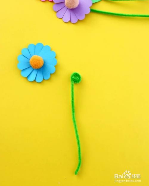 再用热胶枪将扭扭棒粘贴在花朵背面。