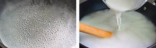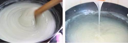 3、在锅中搅拌时一定要转小火3、向一个方向搅拌。随时观察,见淀粉糊变透明粘稠后,可以在擀面杖上挂排即刻关火盛出。