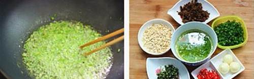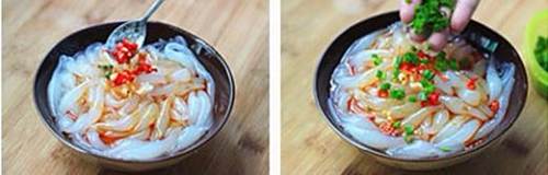 盛入碗中。加入适量盐、味精、生抽、醋。加入适量兑好的青花椒蒜水。加入适量红油。加入适量小米椒。最后撒上葱花提香即可享用。