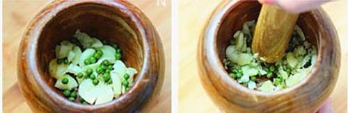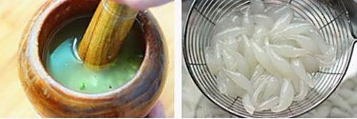 煸香后起锅备用。独蒜拍破,和青花椒一起放入擂钵里。将其冲成泥。加入凉开水兑成蒜水,倒出备用。用漏勺将凉好的凉粉捞起。