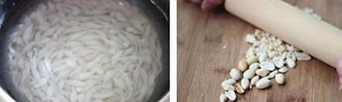将搅好的凉粉全部倒入容器中。将凉粉缓缓倒入漏鱼儿中,漏鱼儿慢慢顺针方向移动。以便凉粉更好冷却,防止在一堆成砣。将漏好的凉粉搁置一旁冷却。将炒熟去衣的花生米用擀面杖稍微压碎备用。热锅冷油。油温五成热时,下入切好的二荆条碎。