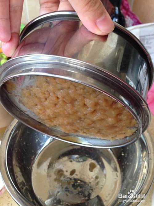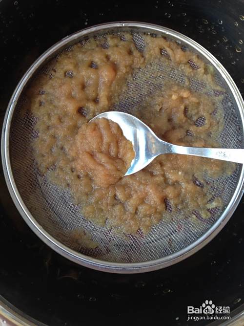 取渣的红枣,用筛网和勺子碾压背面的红枣泥,我们也是为了能够取到红枣水而采用这样的办法,也有人想用蒸红枣的方法,这种红枣泥甜度过高,而且无水可取,所以蒸红枣的方式不提倡在这里使用。