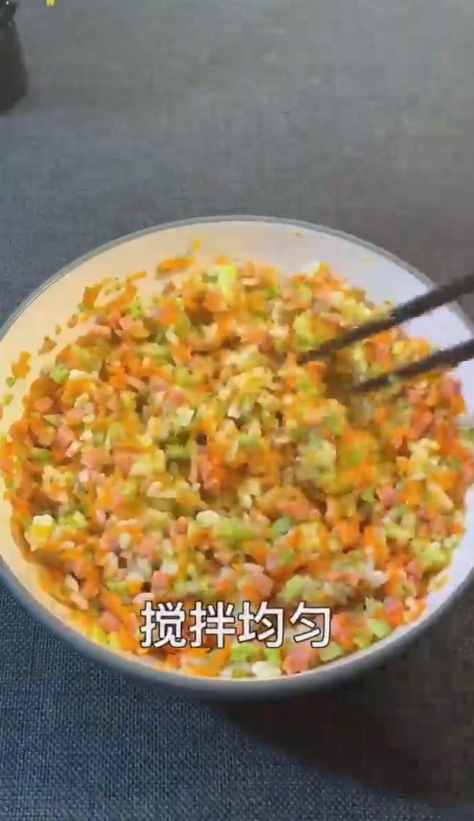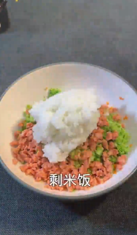 盘中放入胡萝卜、西蓝花、火腿丁、米饭。
