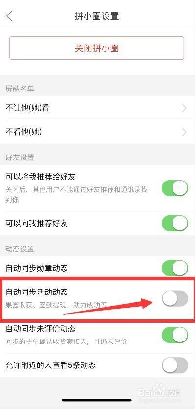 3、在拼小圈设置中,点击”自动同步活动动态“后面的小圆钮,小圆钮的位置变成灰色,即关闭了该功能