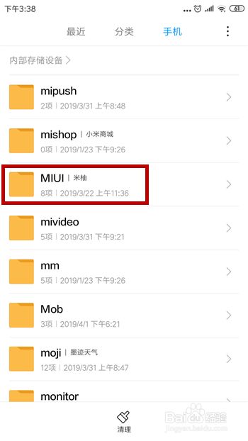 在手机存储文件中找到【MIUI】文件夹并点击(后面标记为米柚)。