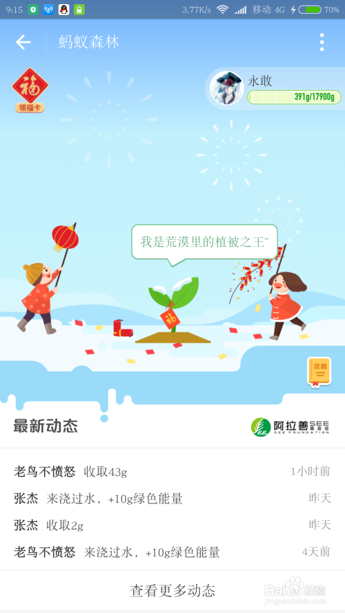 有了能量就可以给好友浇水了,然后获得福卡,分享红包!!当你的蚂蚁森林长成大树后,就可以在沙漠种一颗大树了,想一想就很激动呢。