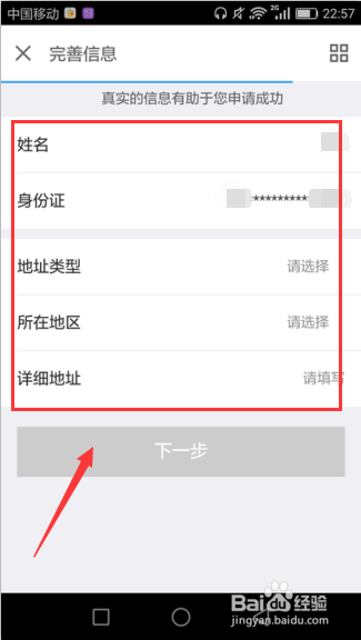 然后进入完善个人信息栏中,填写个人的详细地址信息,信息填写完成后,点击提交