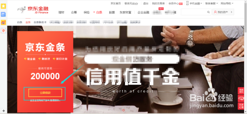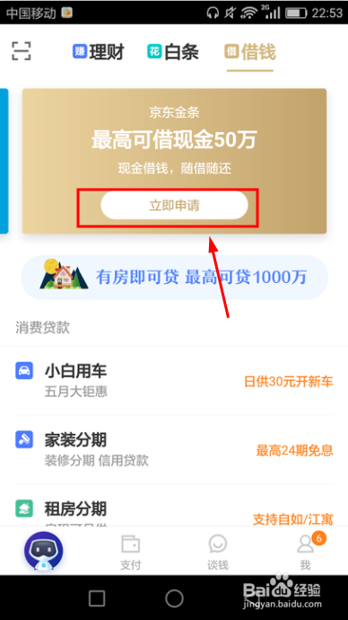 手机端下载京东金融后,登录自己的账号,然后在在借钱栏中,选择-立即申请