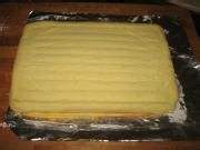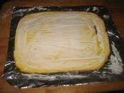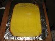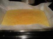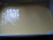 倒入铺了油纸的烤盘了,抹平,轻震几下,震出大气泡